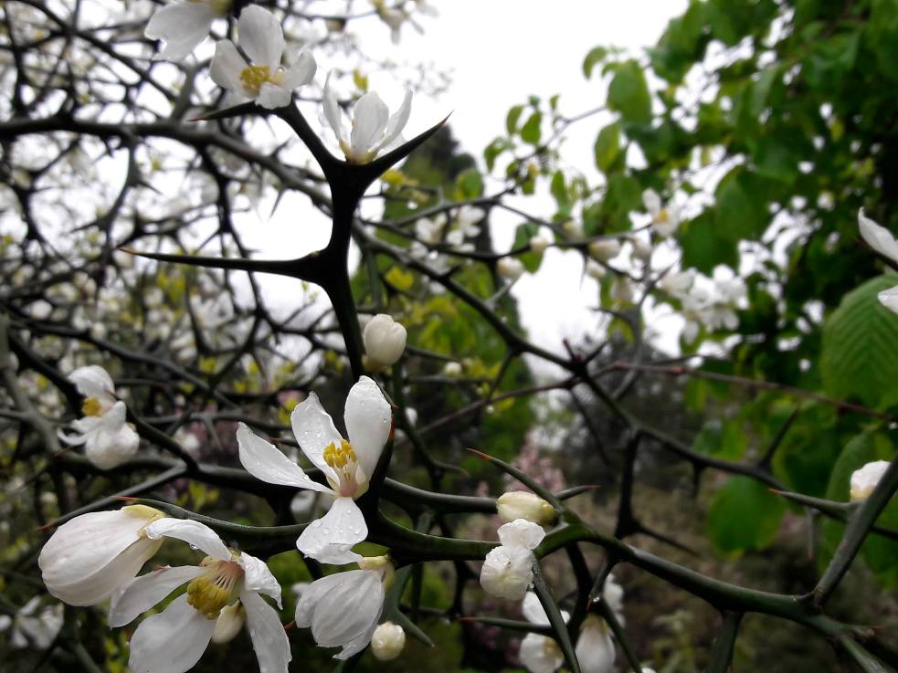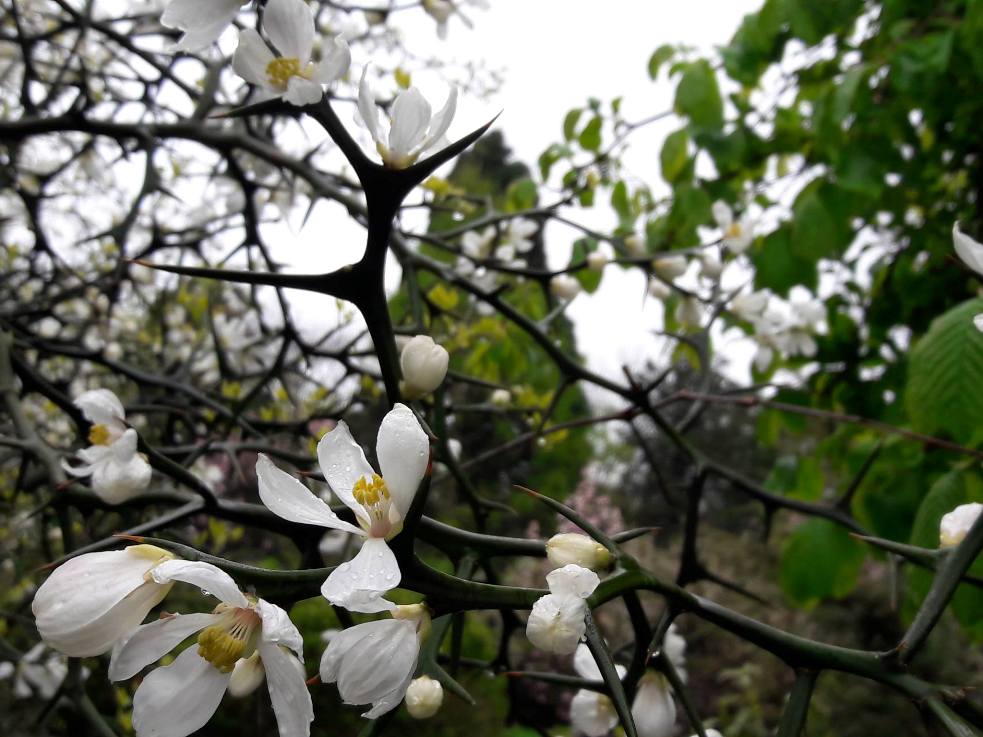 У меня привитая веточка от цветущего дерева бот.сада в Словакии. Растёт энергично, это ничего не сказать. Поглядите на эти шипы - это же просто клыки саблезубого тигра!