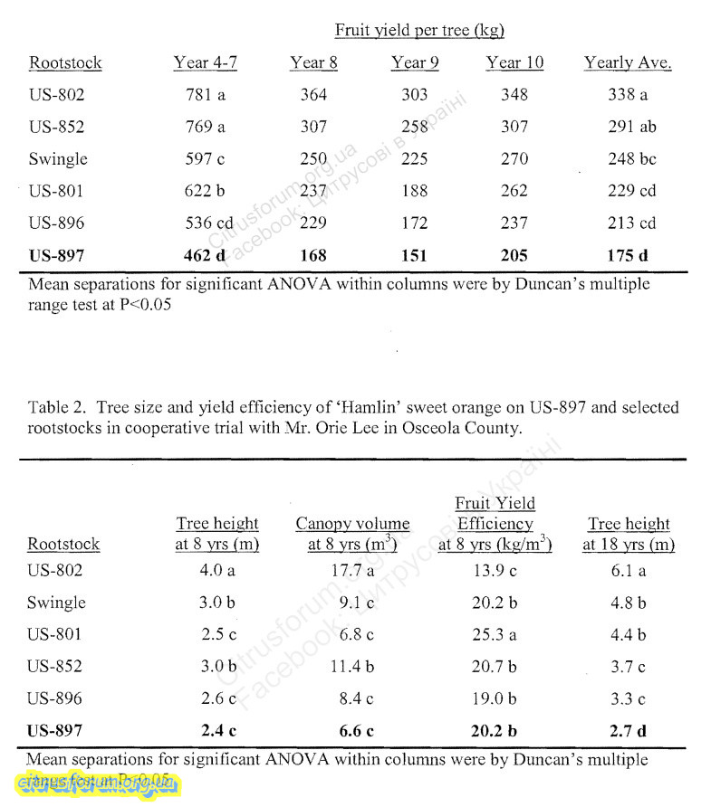 Округ: на підщепі US-897 виросли карликові дерева, які дали хороший урожай на основі розміру дерева та плоди з високим вмістом розчинної сухої речовини (Таблиця 8). Тестування якості плодів у цих інших дослідженнях незмінно вказує на те, що концентрація розчинних твердих речовин у плодах на підщепі US-897 подібна або краща, ніж на багатьох інших підщепах, таких як Swingle і Carrizo, включаючи ситуації, коли вона використовується з прищепами грейпфрута (табл. 9).