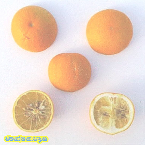 Плоди середнього розміру (5 - 6,5 см), сферичної форми із середньою вагою 120 гр. Шкірка жовтого кольору і жорстка з ефірними маслами.