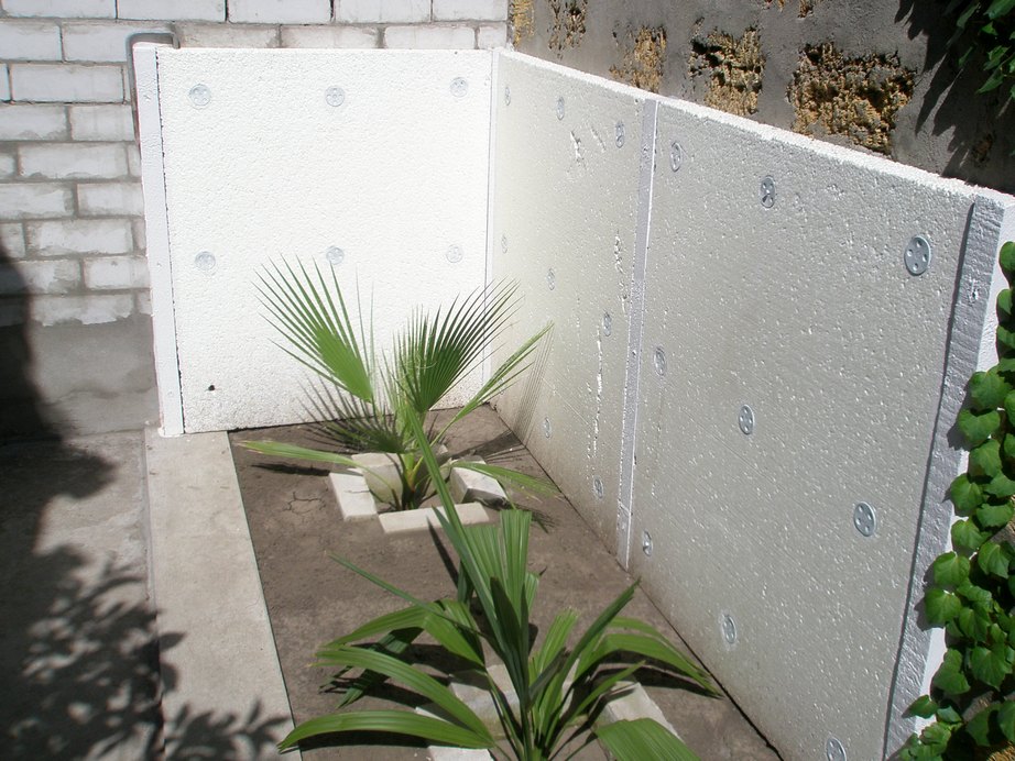 С обратной стороны идёт рейка. Дюбель срезается под размер пенопласта (толщину) и саморез вкручивается в рейку. Конструкция простая и надёжная. Но лучше всего стационарно забетонированный брус и на него крепить пенопласт. Где-то в компе у меня фото было. Очень быстро собирается такая конструкция. Мне же приходится повозится, а так как я укрываю уже в декабре, то хочется побыстрее - холодно и сыро.