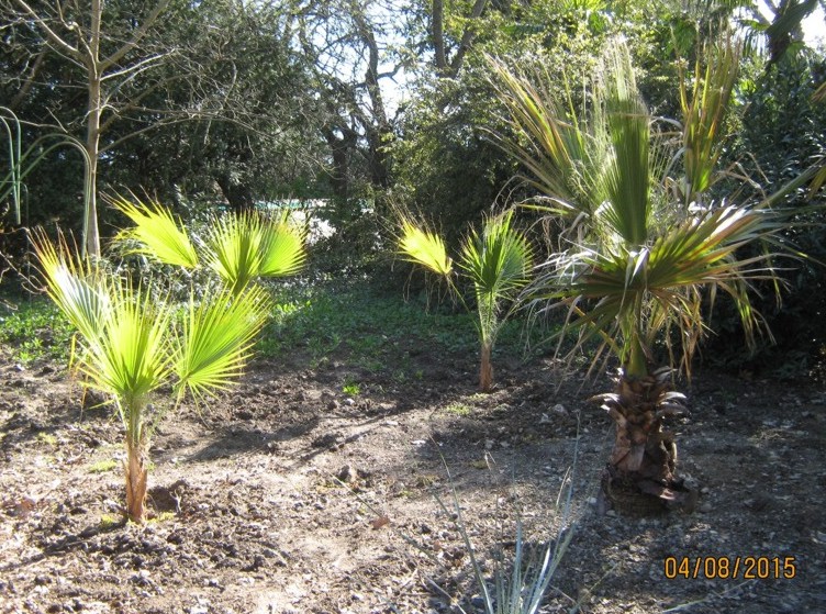 Состояние Вашингтоний, Юбей, фиников после зимы этого года, в целом хорошее. Юбеи уже весьма активно растут. Добавлены на этом участке сразу пару десятков молодых Вашингтоний и фиников, видимо из своих сеянцев, полученных из заказанных где-то семян. И эти сеянцы выглядят после зимы хорошо, в отличие от экземпляров Вашингтонии в Райском Саду, полученных пару лет назад в виде молодых растений.