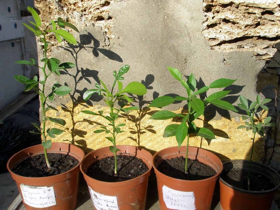 Слева направо (сеянцы 2013 года) - цитрумело свингл, цитранж тройер, ялтинский гибрид, понцирус трёхлистный.