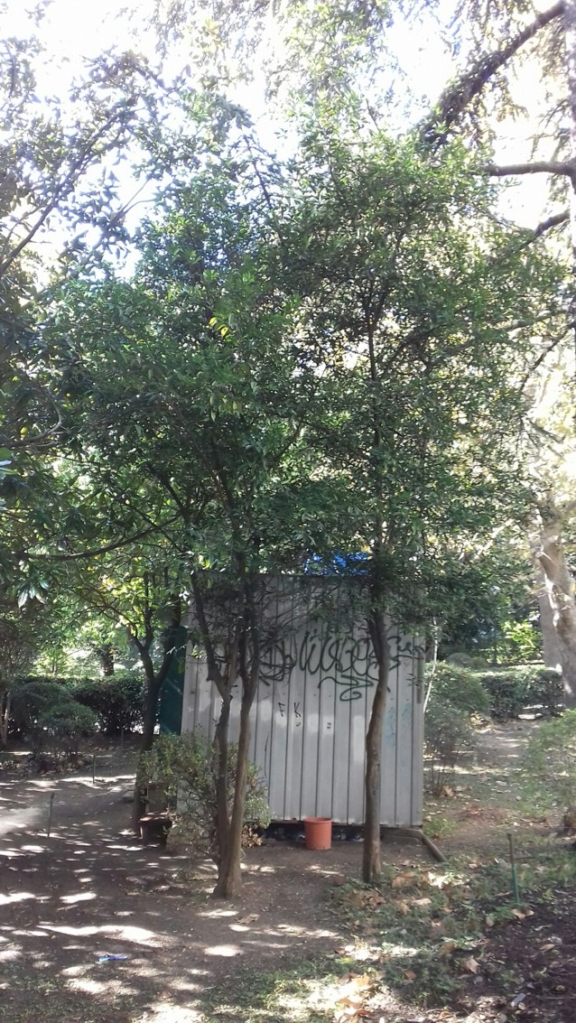 - плоды на нём есть, но, так же как и на Никитском гибриде(его плоды на следующем фото самые мелкие и зелёные) и на дереве Юноса растущем в Никите на северо-востоке основной группы Юносов, плоды совсем маленькие и зелёные, по виду они где-то в середине августа завязались. Это означает что -11С в Никите 1 января этого года цветочные почки заложенные с осени 2015-го года повредили и цветение дали уже почки заложившиеся летом. В Никите это не удивительно и бывало ранее, а вот в Ялте, где например средиземноморские пальмы не были повреждены, это на Ялтинском неожиданно.