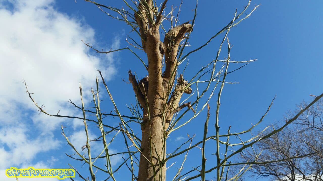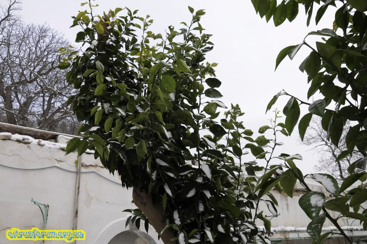 У меня мандарин Томоно на трефе нормально перезимовал в кубе. Крышку ставил всего на несколько дней,когда морозы были от -10 до -21,2*С. Подмёрзли несколько веточек самого последнего прироста. Сейчас выглядит так: