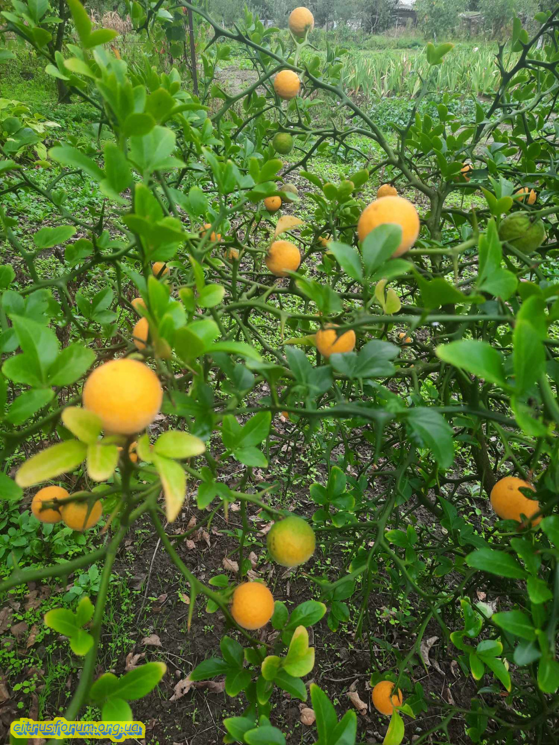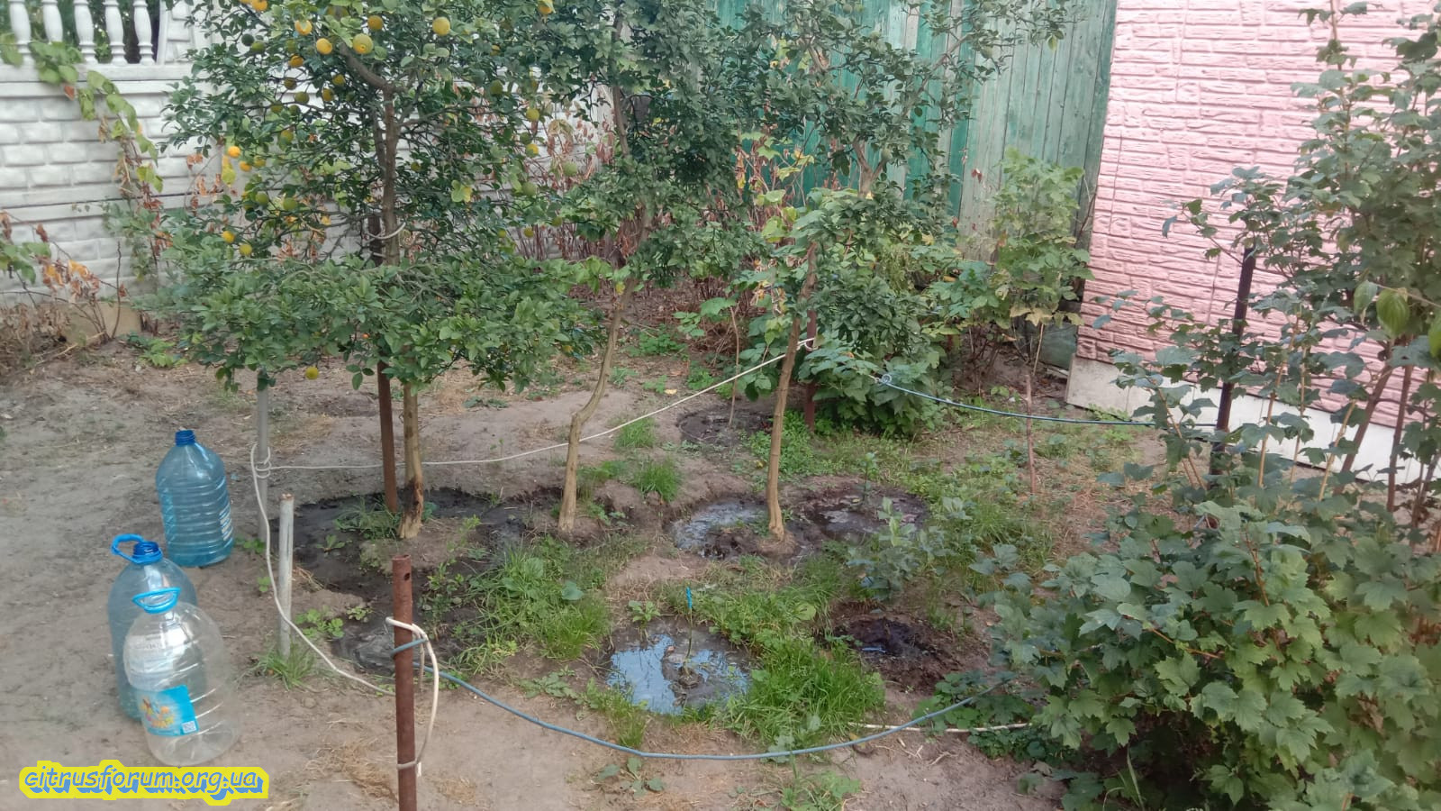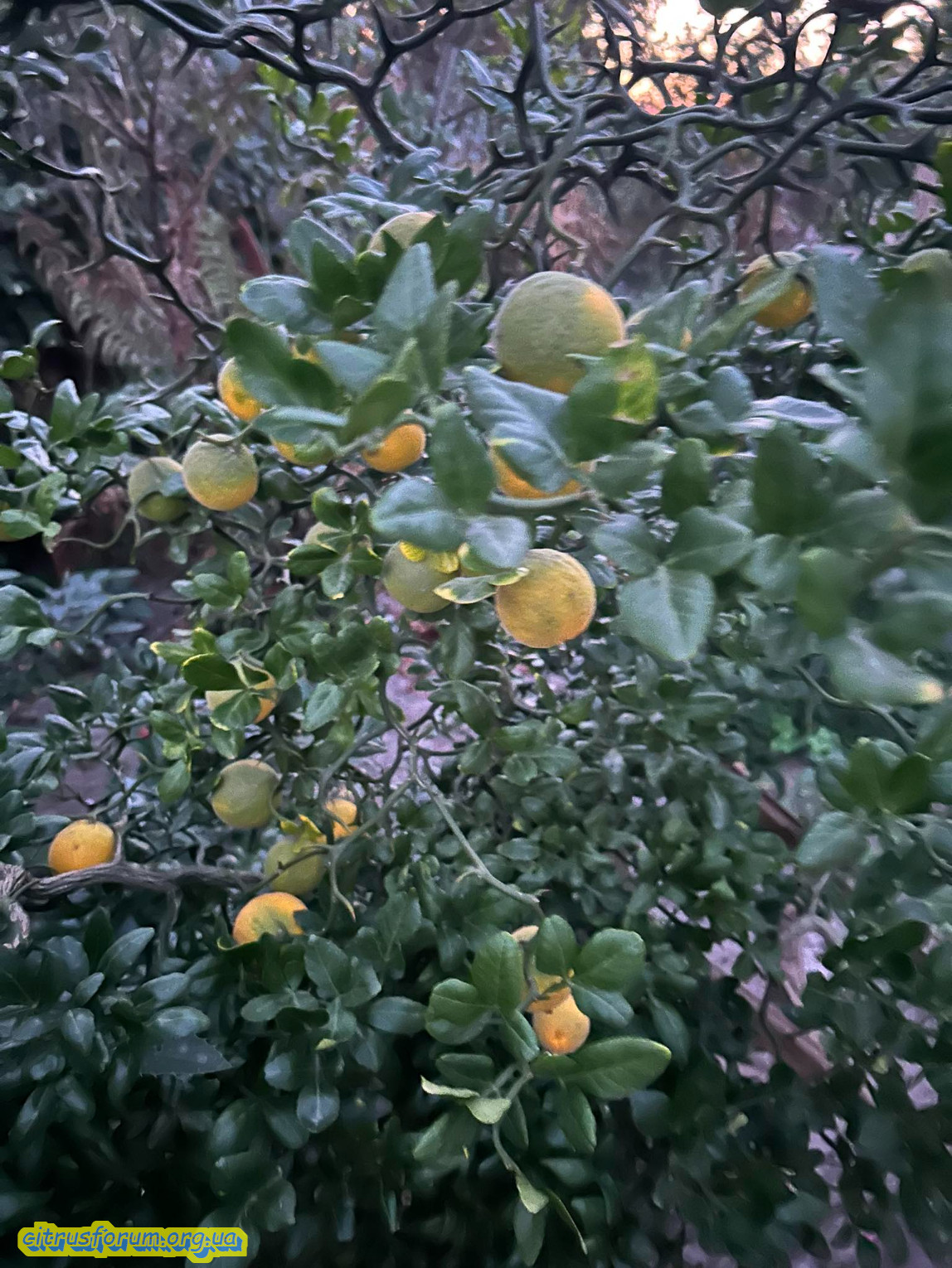 У цьому році дає перші плоди понцир, штамб якого за останні 10 років не підмерзав. Він праворуч на першому фото, хоча саме фото недостатньо якісне, вгорі там можна роздивитися плоди.