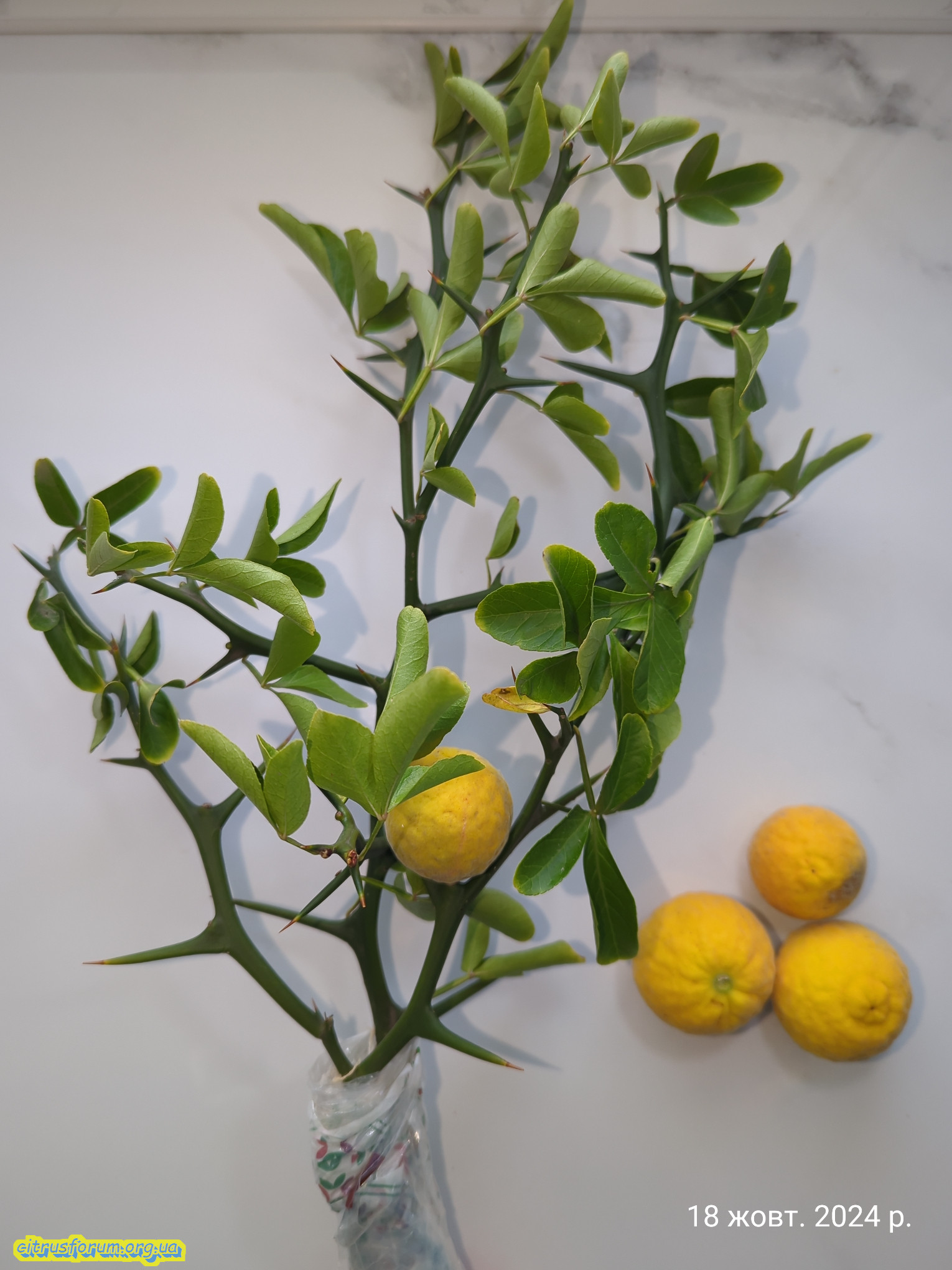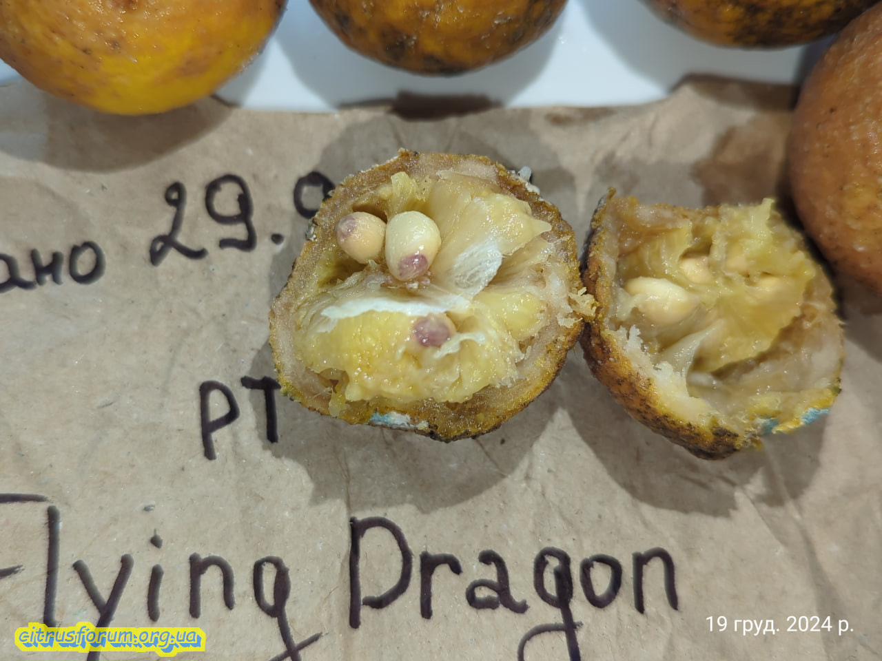 за плоди звичайного Понцирус Трифоліата, який також росте без вкриття, у відкритому ґрунті, в Муро́вані Кури́лівці — Могилів-Подільського району Вінницької області.30.09.2024року, було покладено плоди P.T FD, в холодильник, на стратифікацію. Пізніше 18.10.2024 покладено звичайний P.T. На сьогоднішній час 19.12.2024р, плоди виглядають так: