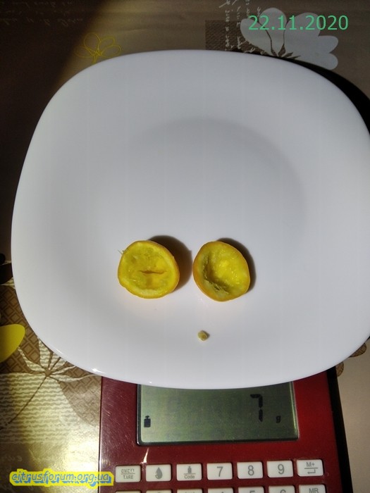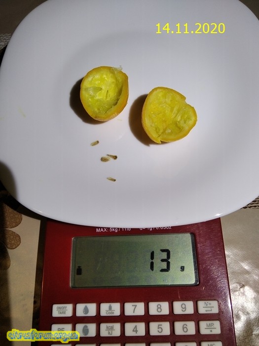 Первый пробовал на 14.11. Альбедо относительно тонкое. Мякоть слегка зеленоватая, может потребоваться более длительное созревание. Плод сочный (сок 38%). Вкус кисловатый; он отлично подходит для прямого употребления в пищу. Слегка горьковатый. Перепонки нежные, не ощущаются. У него дикий запах 5 * или Poncirus, но он не навязчивый, а освежающий. Без внутренних смол. Кора горькая, несъедобная.
