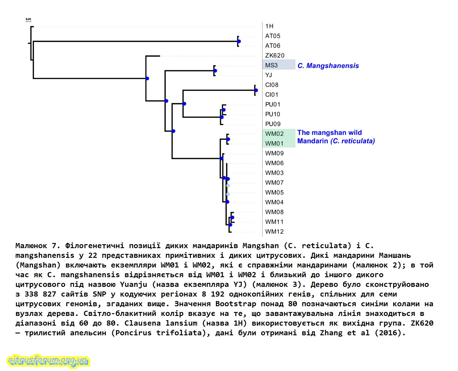 Мал. 7. Філогенетичні позиції диких мандаринів Маншань (C. reticulata) і C. mangshanensis у 22 представниках примітивних і диких цитрусових. Дикі мандарини Маншань включають екземпляри WM01 і WM02, які є справжніми мандаринами (додатковий малюнок 2); в той час як C. mangshanensis відрізняється від WM01 і WM02 і близький до іншого дикого цитрусового під назвою Yuanju (назва екземпляра YJ) (додатковий малюнок 3). Дерево було сконструйовано з 338 827 сайтів SNP у кодуючих регіонах 8 192 однокопійних генів, спільних для семи цитрусових геномів, згаданих вище. Значення Bootstrap понад 80 позначаються синіми колами на вузлах дерева. Світло-блакитний колір вказує на те, що завантажувальна лінія знаходиться в діапазоні від 60 до 80. Clausena lansium (назва 1H) використовується як вихідна група. ZK620 — трилистий апельсин (Poncirus trifoliata), дані були отримані від Zhang et al (2016).