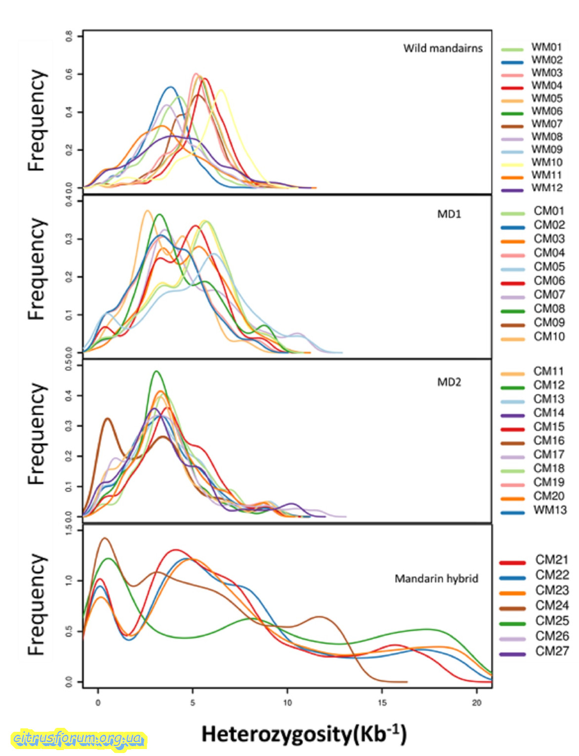 мал.15. Діаграма щільності гетерозиготності для 40 мандаринів у цьому дослідженні, яка була оцінена за допомогою гетерозиготного SNP на kb.