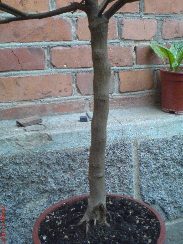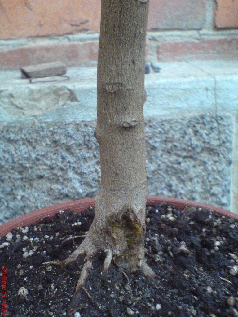 Нашёл летом с голыми подсохшими корнями, лежало некоторое время на солнце, пытался выходить, потеряло много листьев, засохла одна средняя ветка с места прививки и буквально несколько совсем маленьких кончиков на других ветках, дерево живое, листья какие ни есть, но остались, опадали в основном пожелтевшие, повреждённые и большие листья, которые видимо росли при недостатке света.