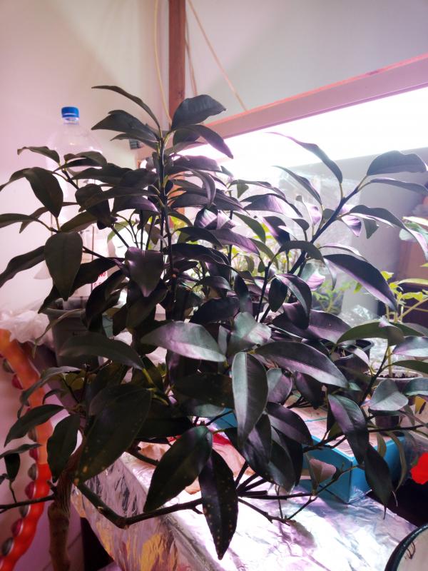Сейчас каждый день придумываю ему вкусняшки по листу чередую. Янтарку, сильно разведенное удобрение для лимонов, циркон, гуматик, просто водичка с фитоспорином, хелатное железо, энерген. Рядом висит мокрое полотенце, на ночь в комнате выключаю батарею, падает температура до 20 градусов, днем 22-23. Рядом с кроной стоит миска с водой. На батарее всегда мокрое полотенце( это помещение для рассады у меня) Лампы горят 16 часов.