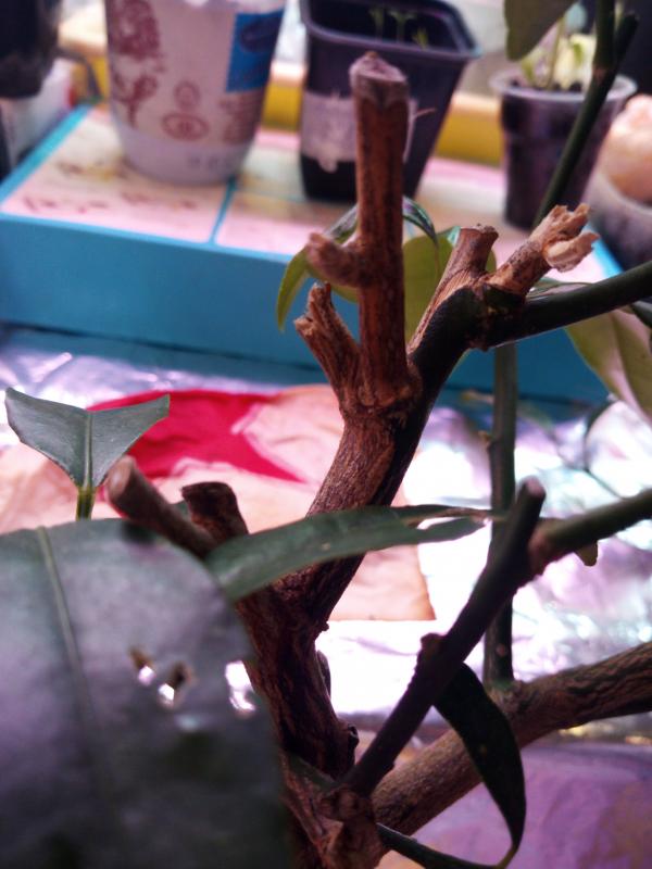 На подвое кумквата вырос росточек. Не удаляла специально, хотелось определить что за подвой.