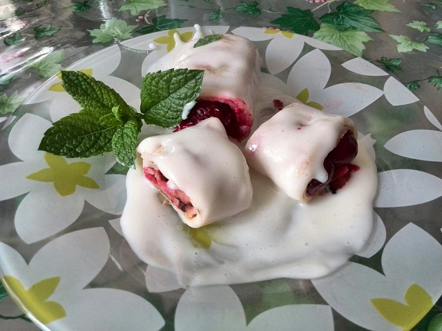 Необходимо, блины сладкие, вишня без косточек, сметана взбита с сахаром.