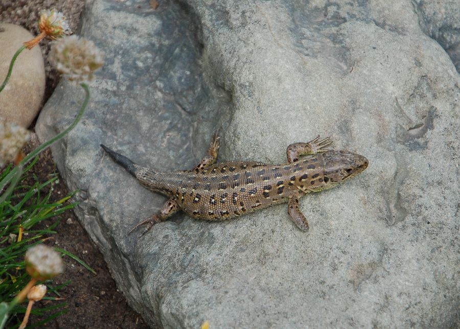 У нас похожая ящерица появилась где-то в 2014 году, когда закончили обустраивать первую цветочную горку. И, конечно, поселилась там. Была она, как видно, довольно сильно травмирована, но раны уже затянулись...