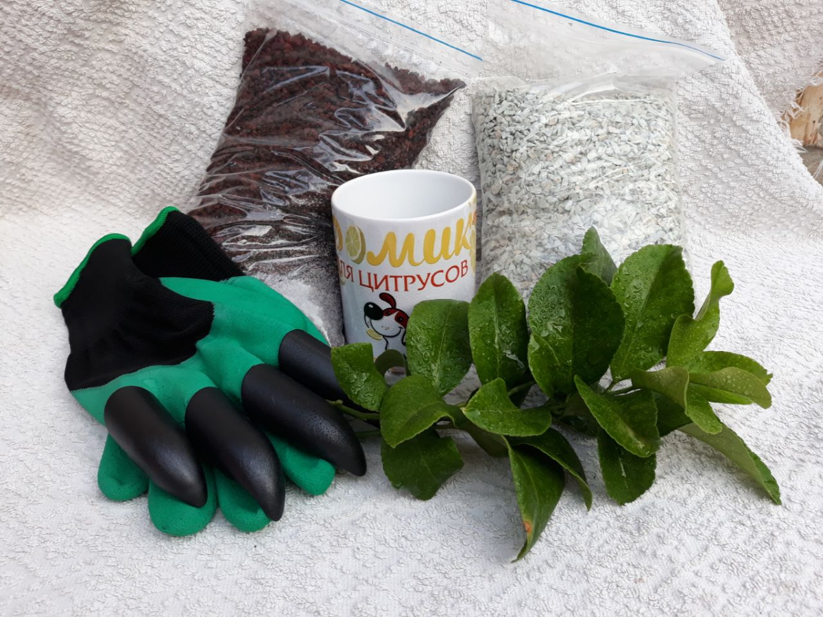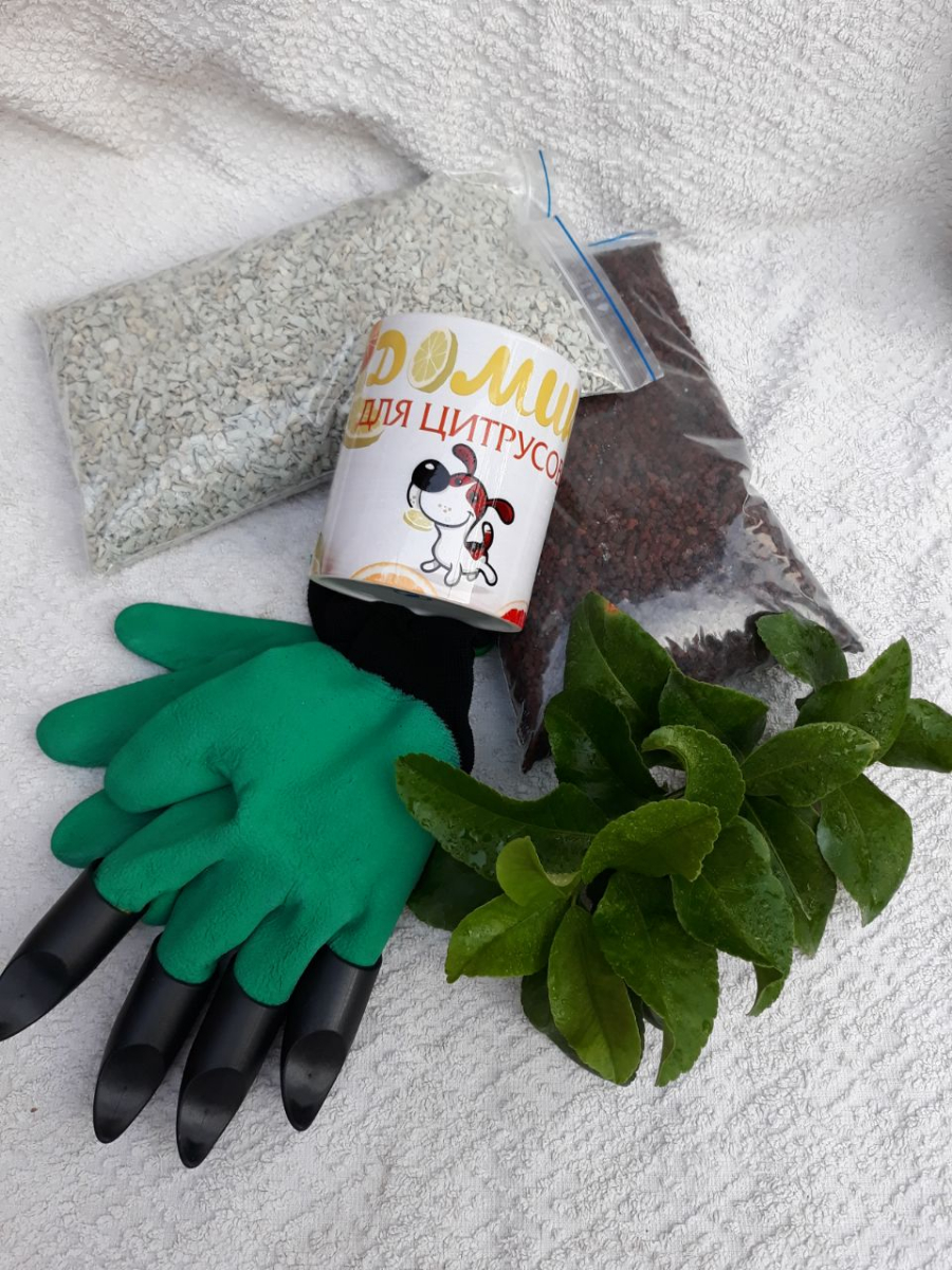 цеолит, лава, перчатки для сада с когтями на правой перчатке, моя чашка с логотипом "Домик для цитрусов" и на выбор черенок Valentine Pummelo или Декопан.