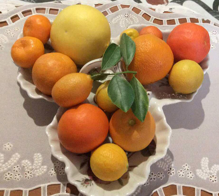 Это часть урожая ДО начала дегустации. В центре красавец грейпфрут, сорт неизвестный, но оооочень вкусный! Рядом с грейпом мандаринки Скороспелый и Хоникан,неизвестный клементин (предположительно Каффин), ниже на секции - два апельсина: Парсон Браун и Вашингтон Невел,а так же лимончики Волкамериана вариегатная и сицилийский. А напротив грейпа - самый крупный мандарин Миягава,ярко оранжевый танжело Векива, кукле ,кумкват Обовата и лимончик сицилийский.А в центре блюда -вариегатная Маргарита.
