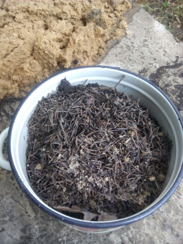 Еще по осени не поленилась и съездила в наш белоцерковский парк Александрия, там есть столетние ели на полянке и под ними я без труда совочком набрала торбу чистых и мелких, за лето прогретых иголок. На мульчу.