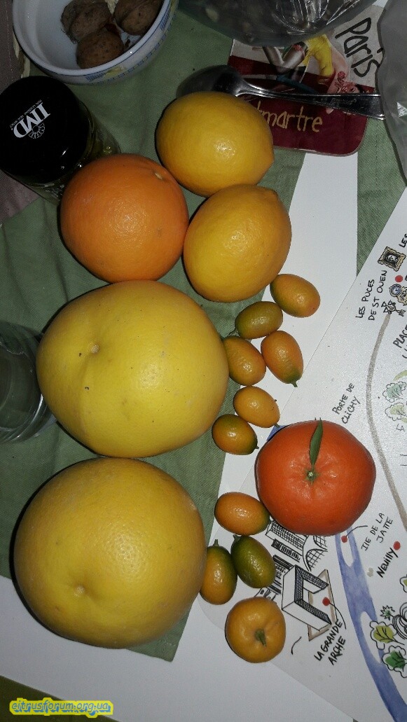 А на снимке справа вверху 2 лимона Мейера, левее плод Нэйвела, ниже грейпы, правее плоды Нагами, оранжевый это клементин.
