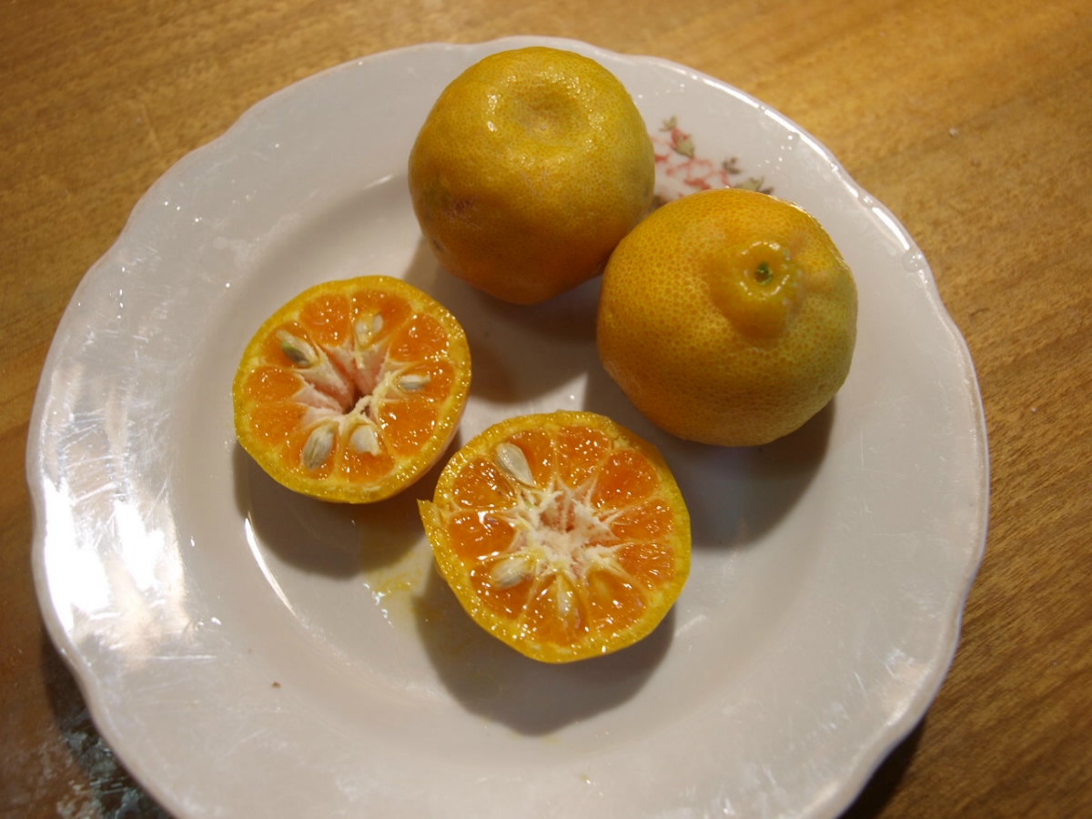 Бывает же совпадение. Я читала, что Чангша - ранний сорт, но решила подержать на дереве подольше. Еще не читая форум, сорвала несколько мандаринок, немного осталось на дереве. Плодоношение тоже первое, все дерево на сегодня сфотографировать нет возможности - все утрамбовано на балконе на холодной зимовке. Мандаринки как по мне маленькие, меньше моих на Окицу, шкурка чистится очень легко, аромат очень сильный, мандариновый. Вкус, как сказал Илья кисло-сладкий, ближе к кислому. Грешу (относительно размера и вкуса) на то, что растение получило мало солнца и еще, что это первое плодоношение. В следующем году проверим, каким будет и вкус и размер.