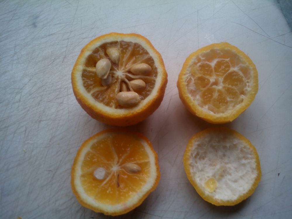 Кожура полностью отстает от мякоти и кажется не по размеру большой. Вкус простой, кисло-сладкий, уступает уншиу по сладости. Присутствуют кости и чувствуются пленки. На фото справа