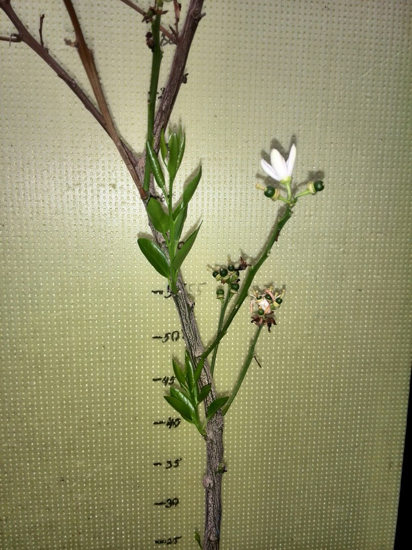 Последние недели заметно листопадит, после зимовки (январь-февраль постоянная темп. в районе 8-10 град.) очень долго отходил, выдал один прирост, и тот хлорозный, слабо цвел, завязал около 5 плодов. Сегодня заметил 7 усыхающих больших и меньших веток и заметный бледный налет именно на самих каламондиновых ветках, сам ствол вроде ничего.
