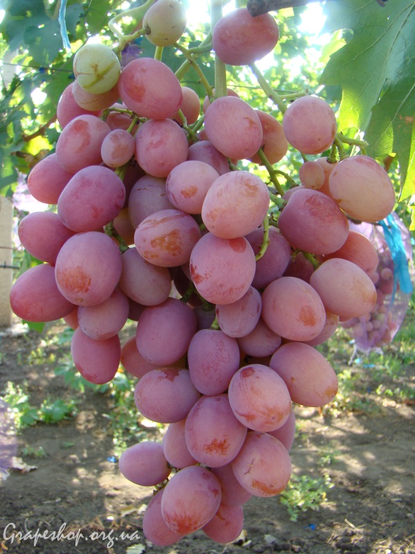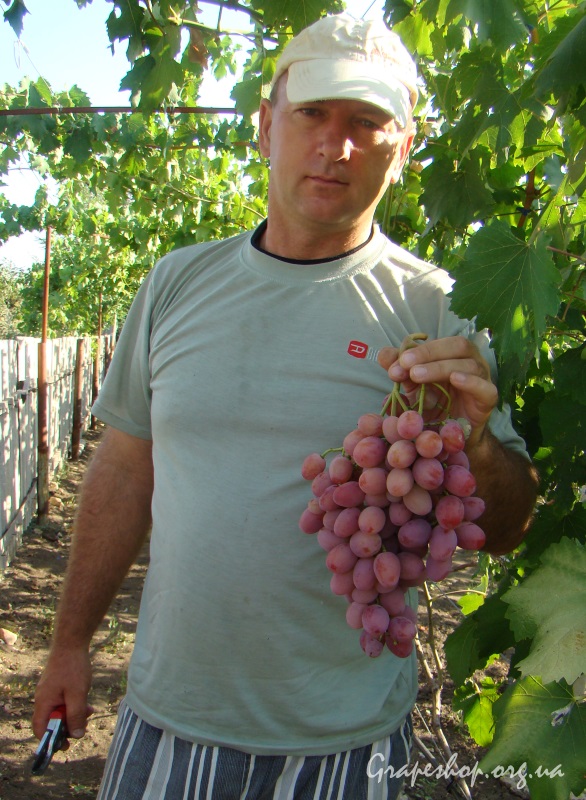 Анюта имеет среднерыхлую гроздь, поэтому ее большие ягоды не давятся, имеет красивый темно-розовый окрас и отличный мускатный вкус.