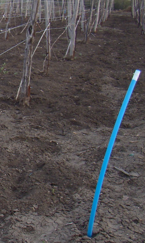 Так как у меня виноградник посажен на двух участках и в разное время, я испытываю две абсолютно разных системы полива, хотя есть у них одна общая важная особенность - вода поступает под землю. Подземный полив предпочтителен для меня из-за того, что не пересыхает и не засоливается верхний шар почвы, кроме того не нужно мульчировать, рыхлить и т.д.На первом участке еще при посадке в посадочные ямя была установлена пластиковая труба 50-ка, нижний конец которой вставлен в мешок с ведром щебня, а верхняя выступает на 10 см. над поверхностью почвы. В трубу выведено четыре микротрубочки от капельницы. Скорость подачи воды при включенной системе - 12 литров в час под куст. Эта же система используется и для ирригации. Я вношу четко нормированное количество удобрений, расчитанное по необходимому количеству элементов для каждого периода вегетации винограда, под каждый куст, делая их маточный раствор и подключая спецприспособление, впрыскивающее их в работающую систему полива. Пока в этой системе все нравится. На втором участке , в междурядье на всю длинну выкопана траншея глубиной 50 см. На дно улложена обычная пластиковая труба, в которой через 50 см 1мм сверлом просверлены дырочки. Потом это место обвязано в два слоя плотным агроволокном, что бы дырочки не забивались грунтом. Траншея засыпана до самого верха навозом. Примерно за пол часа в 55 метровой длинны траншею уходит куб воды. Эта идея мне очень понравилась, но все время гложит мысль - а все ли дырочки работают и все ли кусты получают одинаковое колличество воды. В этом недостаток способа, но навоз и вода вкупе, масса червей и очень быстрое разложение навоза, двусторонний полив каждого ряда, ведра шампиньенов с виноградника :-) - это все в плюс!