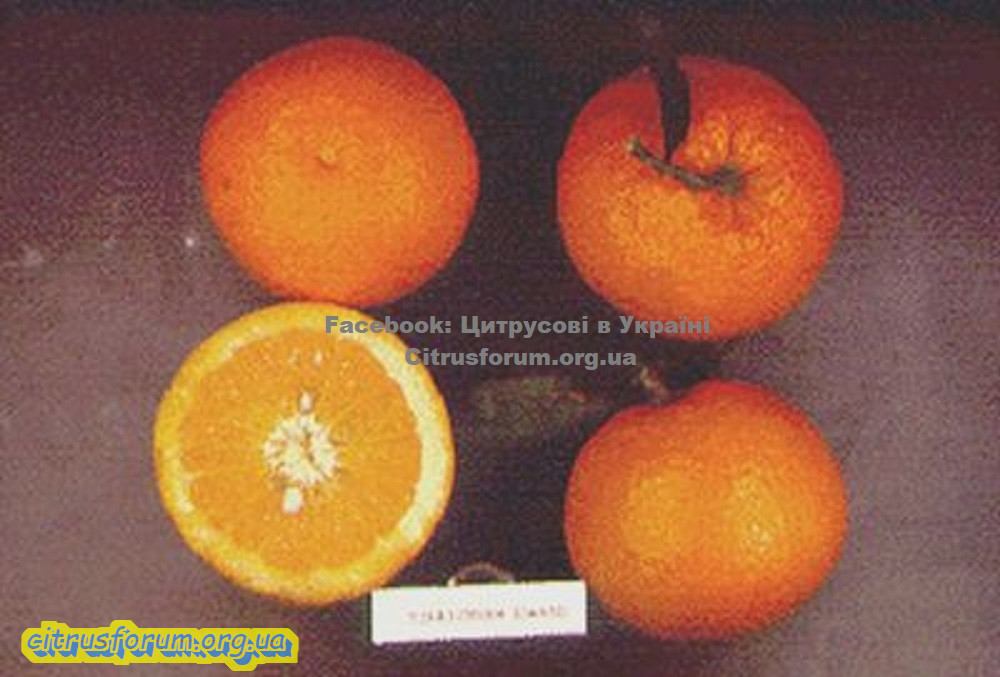 Плоди середнього розміру, округлі або злегка сплющені, зібрані в кисті. Шкірка середньої товщини, світло-оранжевого кольору, поверхня гладка. М’якоть добре забарвлена; соковита, без кислоти; смак солодкий.