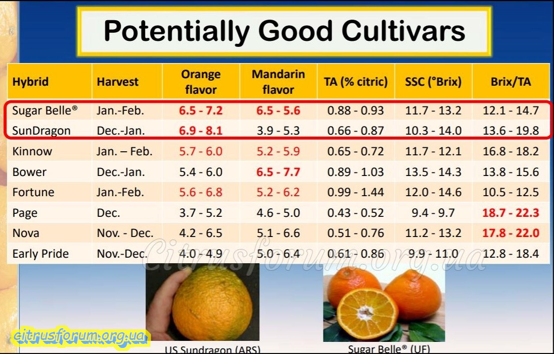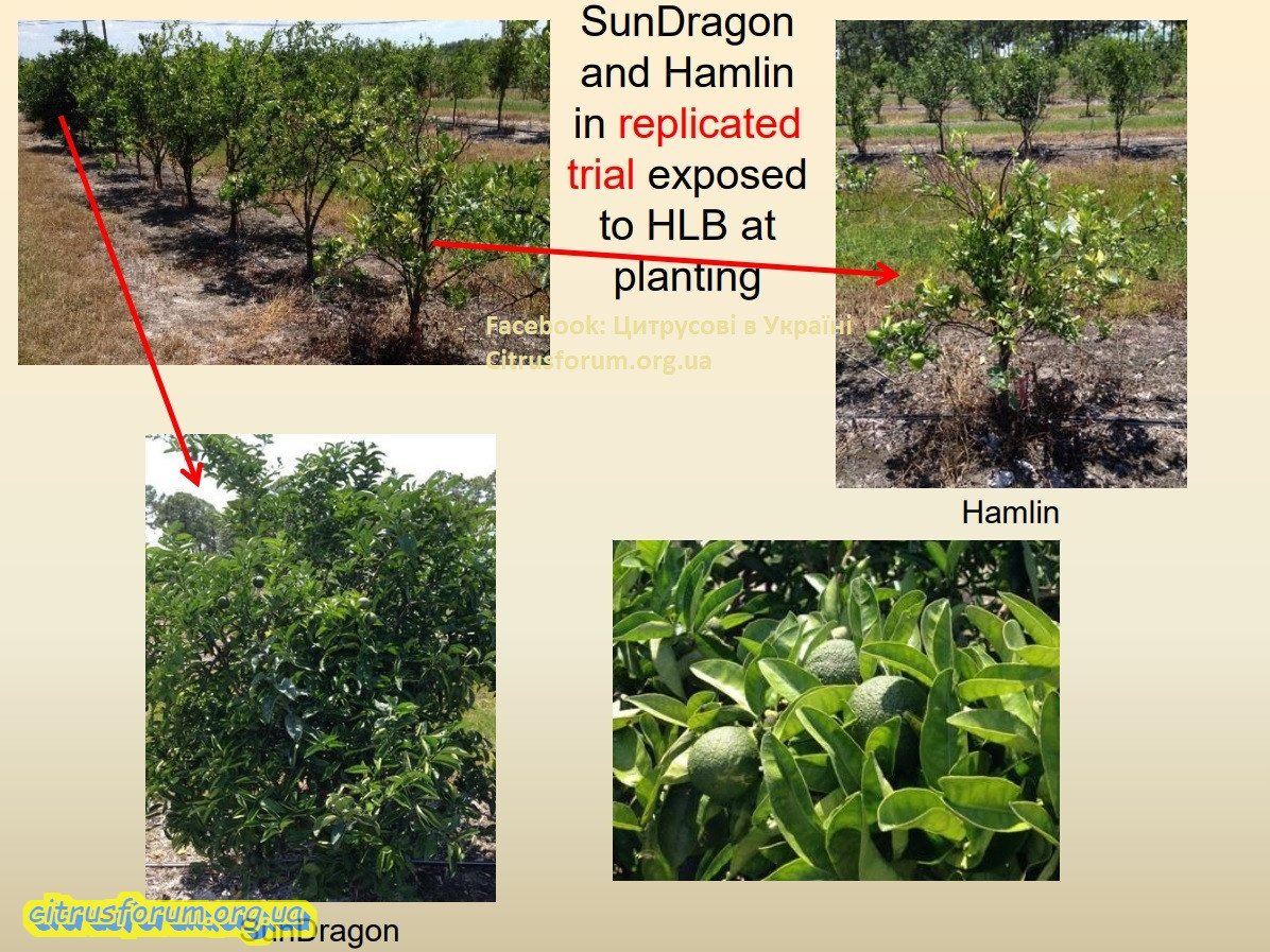 US SunDragon. Солодкий-апельсиновий гібрид, включаючи Poncirus у своєму родоводі, з чудовою толерантністю до озеленення (HLB).