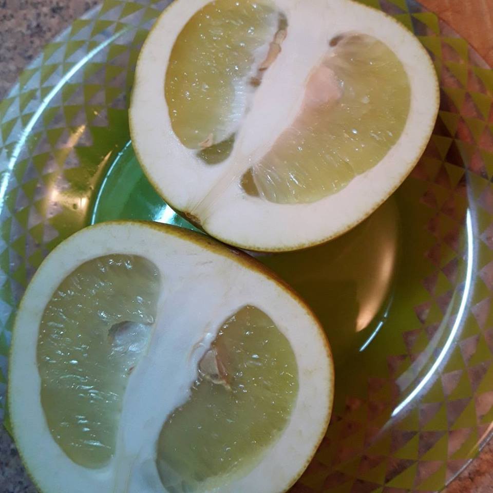 Розовое памело пинк. Плоды сами отпали от черешка - созрели. Вес плода 600 гр, мякоть обычного светло-желтого цвета. Вкус сладкий сочный, хрустящий, присутствует обычная для памело горчинка. Пленки отделяются хорошо и в общем вкус значительно лучше покупных памел.