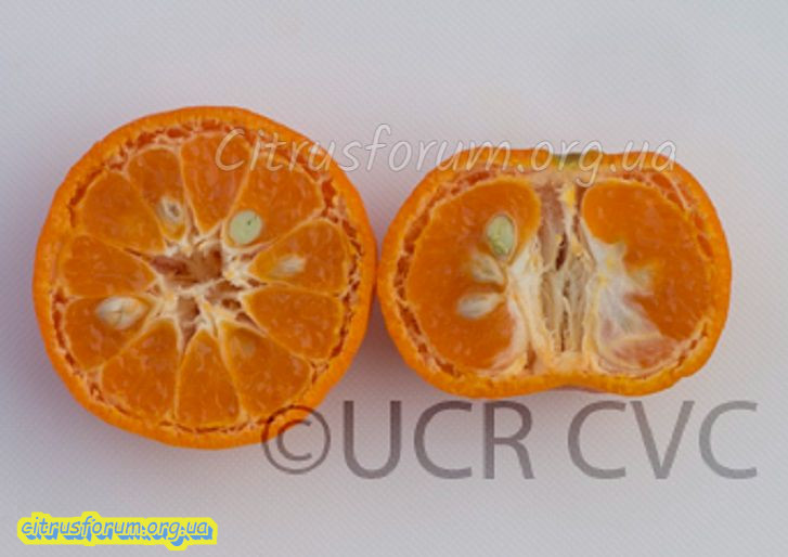 Сегменти від 9 до 10 легко відокремлюються, вісь порожниста. Колір м'якоті світло-оранжевий, ніжний і соковитий, на смак приємний. Насіння помірно численні, довгі загострені, поліембріональні. Ранньо-середній період дозрівання. Швидко втрачає якість, якщо зберігається на дереві.