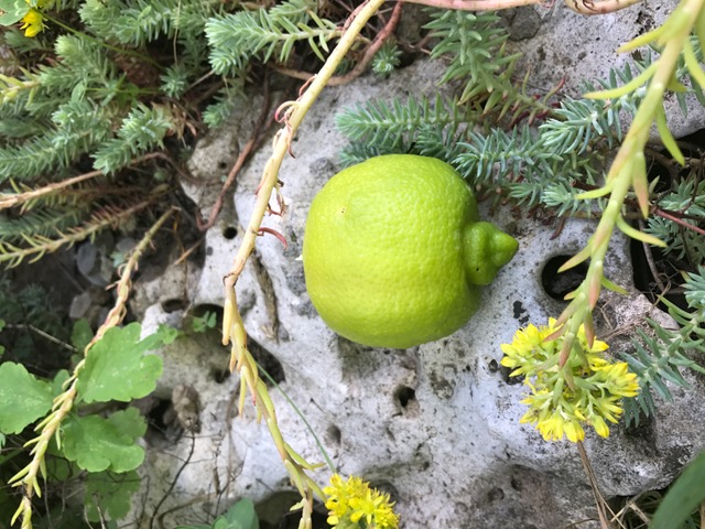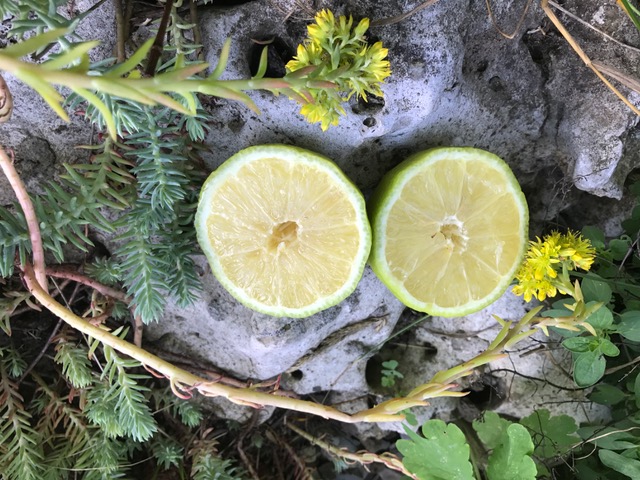 Наверное, это уже был пик созревания: размер плода стал не "мелкий лимон", а средне-крупный(диаметр 7-8см); аромат цедры ещё больше усилился, стал бергамотово-жасминовый; вкус сбалансировался и стал объемным, сладко-кисленьким(благо не приторно сладким, а освежающим). Проявилась очень красивая форма плода - граненая сфера, с вдавленным крупным двухъярусным носом. Только вот желтый цвет снаружи так и не появился. Хотя дерево стояло последние два месяца на открытом Солнце без притенения.