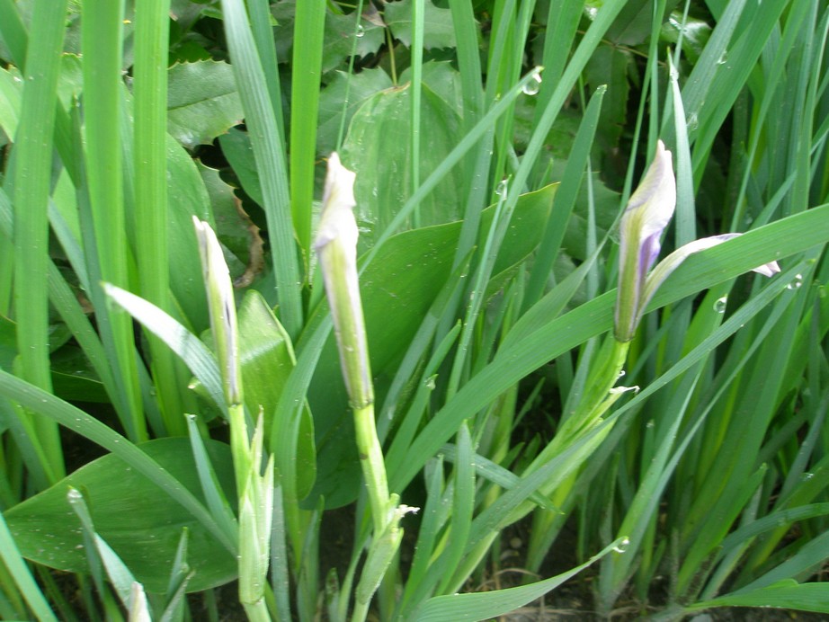 По мере зацветания буду выкладывать фото. Пока только листья для сравнения. Вверху ирис жёлтый или болотный его ещё называют (он более высокий). У меня он и без болота растёт - просто его немного надо поливать в отличии от ириса с широкими листьями, который как суккулент растёт.