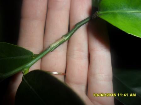 Пересматривала сегодня свои прививки, сделанные 13 февраля, (спасибо большое за череночки Тане Кузьмук).И вот такое обнаружила: привой лаймкват юстис, привит в крону сеянца клементина. Половинка "расщепа" отмерла