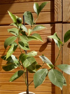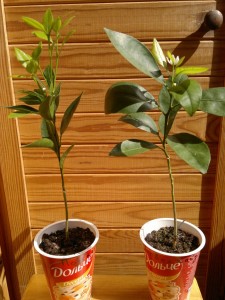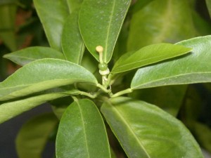 . В отличии от зацвевшего мандарина о котором я рассказывал здесь: http://citrusforum.org.ua/viewtopic.php?p=18698#p18698, этот сеянец цитруса (точно не уверен даже виде, но скорее всего тоже мандарин) я специально не готовил к плодоношению. Готовил для дерева-сада. Рос правда в аналогичных условиях с подопытным. Стрелка указывает на место цветения, а овал на - место перетяжки. Насчитал на ветке с цветком четыре места прищипки, но ветка продолжала расти с верхней почки (если считать порядок ветвления "по книжке", то это ветка 1-го !!! порядка). Бутон пока один.