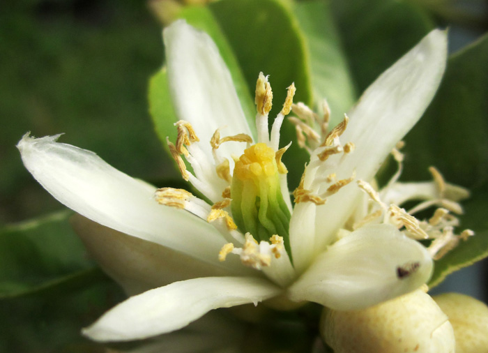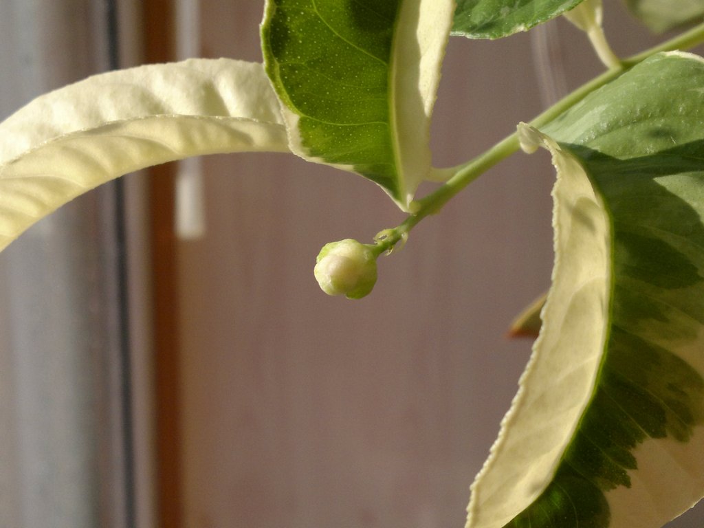 А вот и фото бутонов с характерной для РБ (даже на стадии открытия бутона) завязи. Первый открывшийся бутон имел недоразвитую форму плода, больше похожую на вытянутый лимончик, чем на РБ. Но вот на днях раскрылся второй бутон, в котором отчетливо видны пальцы РБ. Но и тут есть уточнение. У моей РБ в последний прирост вызрело 5 веток-альбиносов и, судя по всему, на такой же ветке от предыдущего прироста завязался плод-альбинос.
