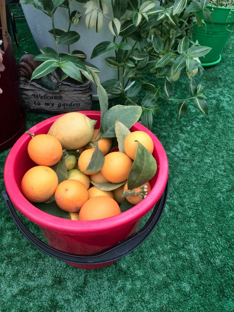 Сняты последние плоды лимона Мейер, немного плодов сразу ушло на угощение, в ведерко поместился плод Свитти, плоды лаймквата, и плод Рубино Россо он же Амоа 8.))