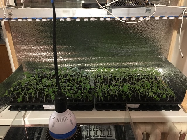 Хочу поділитися досвідом підсвітки. Мої цитрусові переїхали до друга в теплицю, тому вільними виявилися світодіодні лампи і панелі (власного виробництва). В цьому році вирішив під ними виростити розсаду.