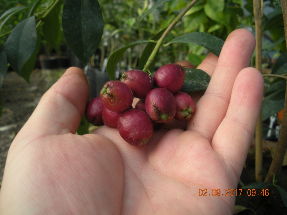 На 12-й странице показывал фото цветения растения, которое получил под названием Syzygium oleosum, или Blue Lilly Pilly. Но вот созревают плоды, и получается, что это не совсем то. Небольшое исследование позволяет предположить, что это его близкий родственник Syzygium paniculatum, или Eugenia paniculata, или Australian Brush Cherry, или Magenta Lilly Pilly (это всё синонимы, а не разные растения