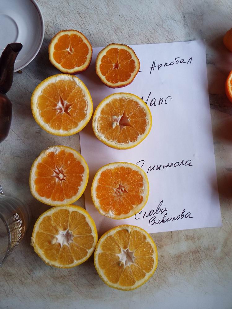 Напрашивается вывод - что это гибрид помело с мандарином уншиу - похож, но не идентичен японским гибридам типа натсу-микан и обовоидеа.