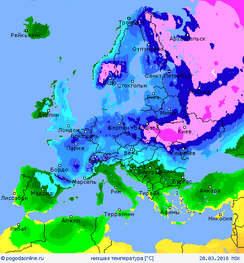 Почему так - надо будет почитать метеорологов, а карты погоды показывают на сегодня картинку минимума температур только с небольшими неожиданностями в других частях света, не в Европе: