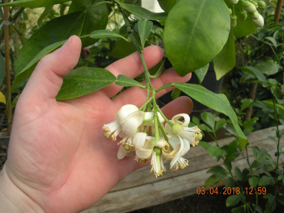 . Несколько дней назад цвёл Castagnetola - гибрид апельсина и грейпфрута. Размер цветков напоминает грейповый. Плодов в этом году не будет - я оборвал цветы и бутоны. Размер растения пока что слишком мал для таких крупных плодов.