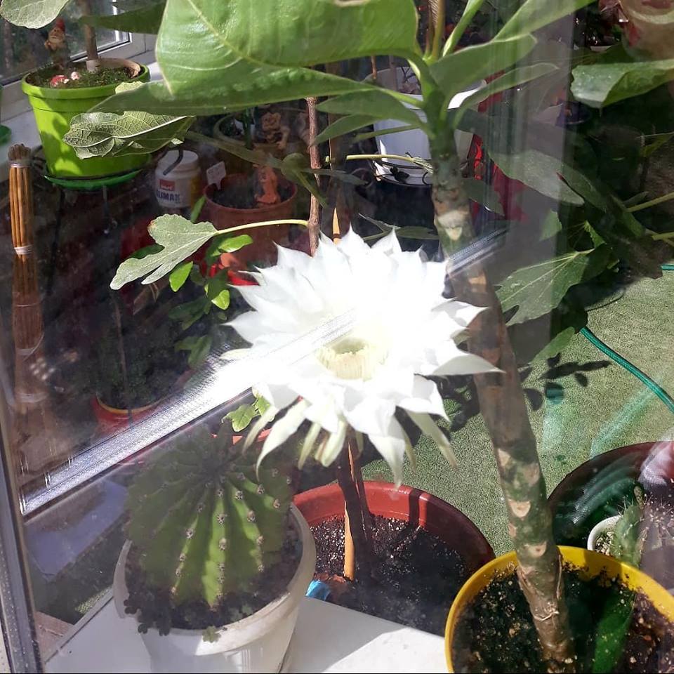Кактус эхинопсис цветет, плюмерия и инжир на фоне)