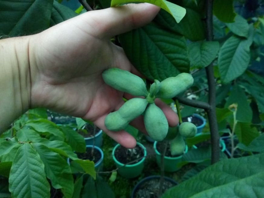 Плодики разных сортов азимины на 13 июня 2018 г. Деревца растут в контейнерах от 15 до 25 л, под притеняющей сеткой (это те, которые я показывал на видео об опылении азимины).