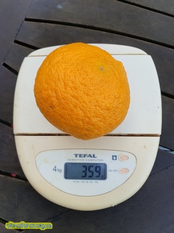 В общем, вчера попробовали - восторг! Прежде всего, после отрыва с ветки, удивил вес плода - не пропорционально тяжёлый. Визуально размер плода и так из крупных - здоровенный апельсин, или средне-крупный грейп, но вес показался чрезмерным и для этого. Когда разрезали стало ясно - сока море, от сюда и тяжеловесность. Шкурка толстая апельсиновая, однако рыхлая - чистится как у мандарина. Характер плода и вкус 50/50 вкусный апельсин и вкусный мандарин + плюс ещё доля какого-то чудного привкуса. Плёнки для плода подобного размера не были грубыми, не скажу, что совсем не заметные, скорее дающие возможность на выбор - хочешь чисть, хочешь съедай. Аромат сильный, больше апельсиновый с нотками ванили. Шкурка мягкая, приятная для поедания, лёгкая горечь присутствует незначительно. Косточки есть, на плод было примерно 6-8штук.