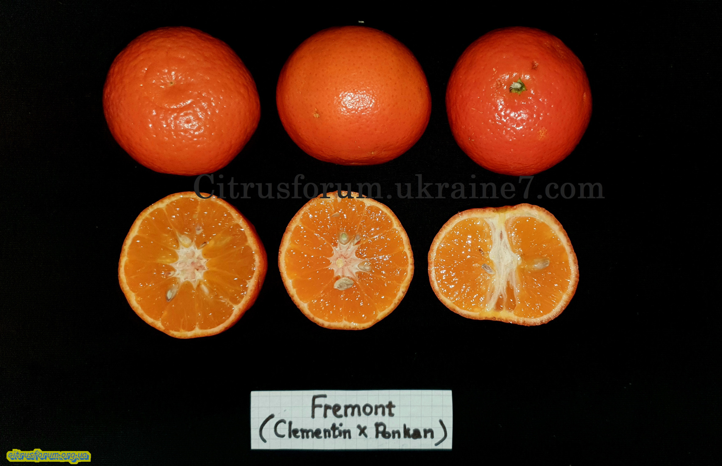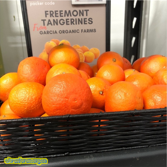 'Fremont' (Clementin x Ponkan). Дуже похожий на 'Nova' мандарин (Commune x Orlando tangelo). Смак більш ніжніший, кислинки не відчувається. Дуже привабливі плоди, гладка оранжево-червона шкірка, яка чиститься не погано. Перегородки (сегм.мембрани) чуть відчуваються біля серцевини, насіння є (4-8шт/плод). Цукристість 12-15.6%. Взагальному дуже смачний! гібридний мандарин.