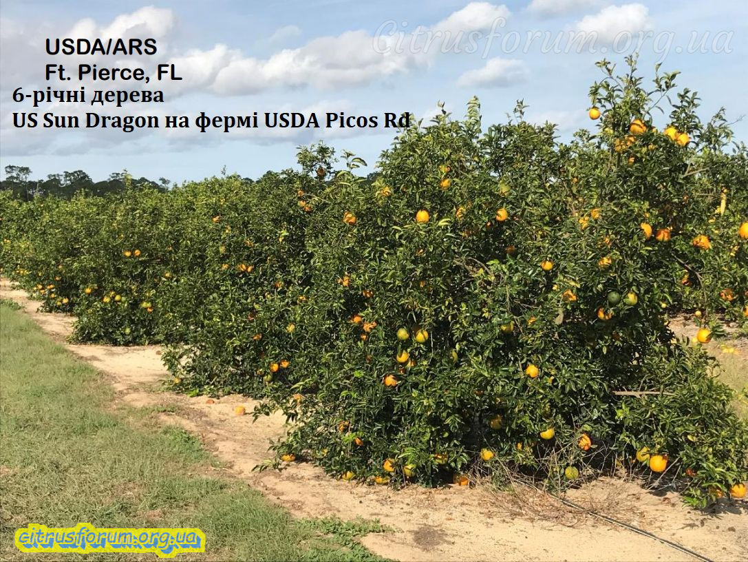 US SunDragon. Солодкий-апельсиновий гібрид, включаючи Poncirus у своєму родоводі, з чудовою толерантністю до озеленення (HLB).