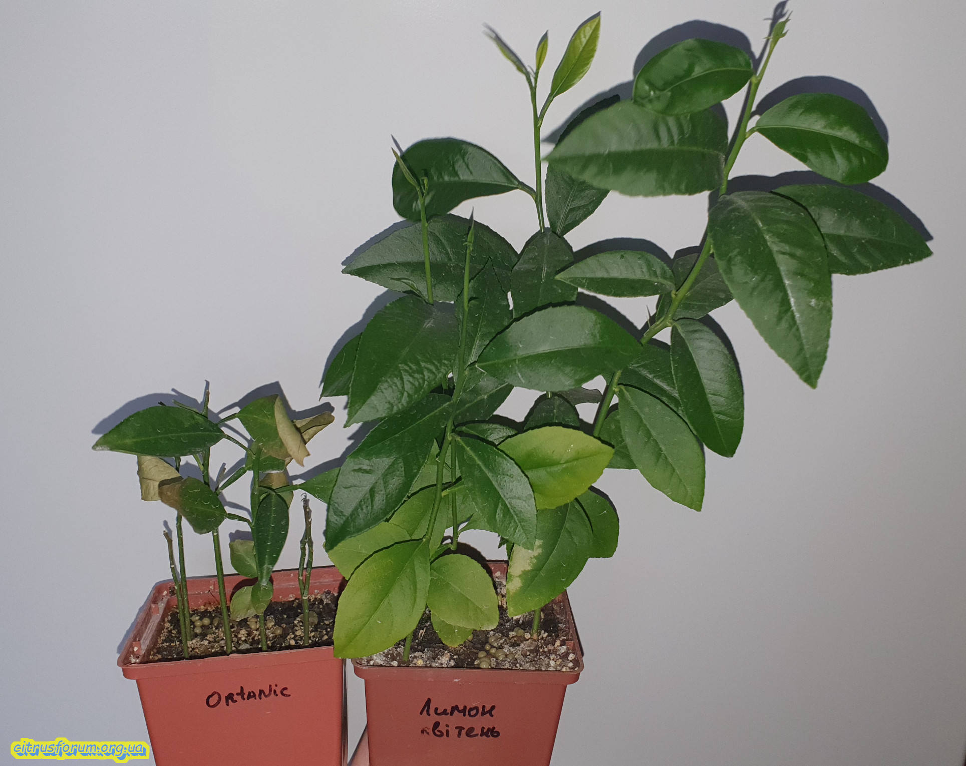 Міні експеримент з сіянцями, з ліва тангор Ortanique, з права лимон. Грунт, умови одинакові. Поки без відмінностей в рості.