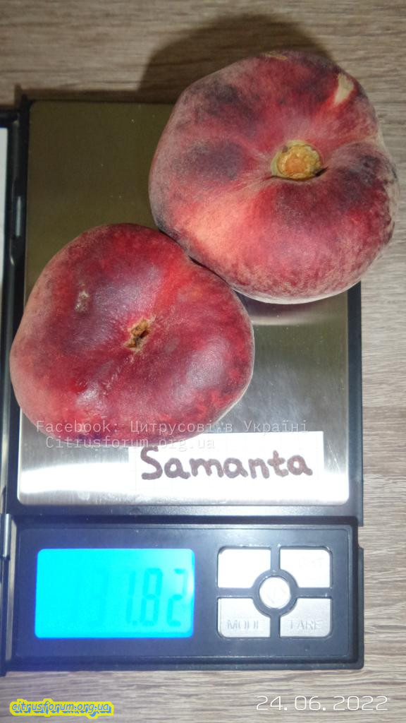 Інжирний персик 'Platibelle', солодкий, без кислинки. Мякоть не сильно хрустка, середньо-соковита.