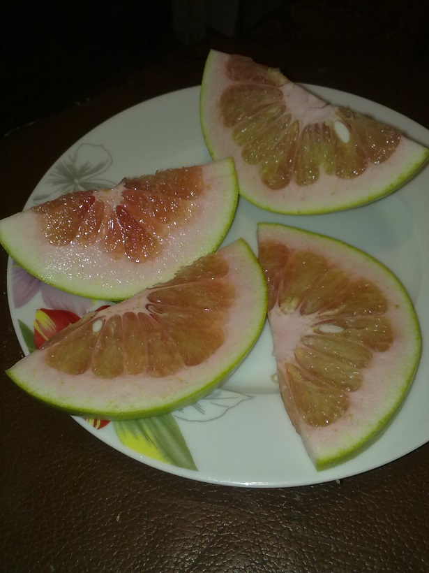 Так же сегодня была не запланированная дегустация помело Као Пан. Растение не большое и на финальной стадии созревания ему явно стало тяжело вынашивать плод. Что могу сказать, неожиданно мякоть оказалась пигментированной, плод хоть и немного не дозрел но был вкусным и сочным, дольки очень тяжело чистятся, косточки были но в основном не полноценные, в общем всем понравился.